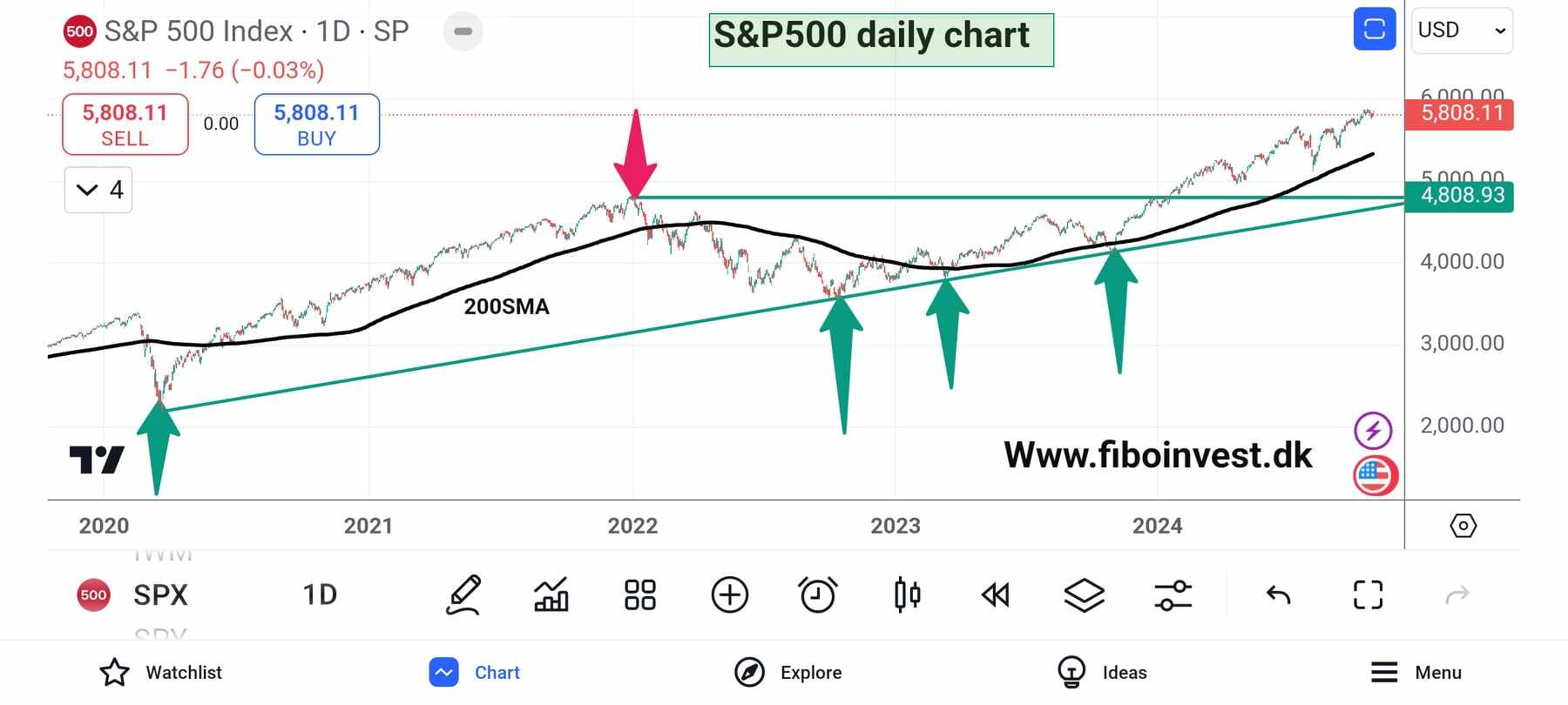 Indekset bevæger sig fortsat i en opadgående trendkanal og ligger over 20, 50 og 200SMA. Der er kortsigtet støtte ved $5.500 og langsigtet ved $4.800, med potentiale for yderligere stigninger mod $6.000.