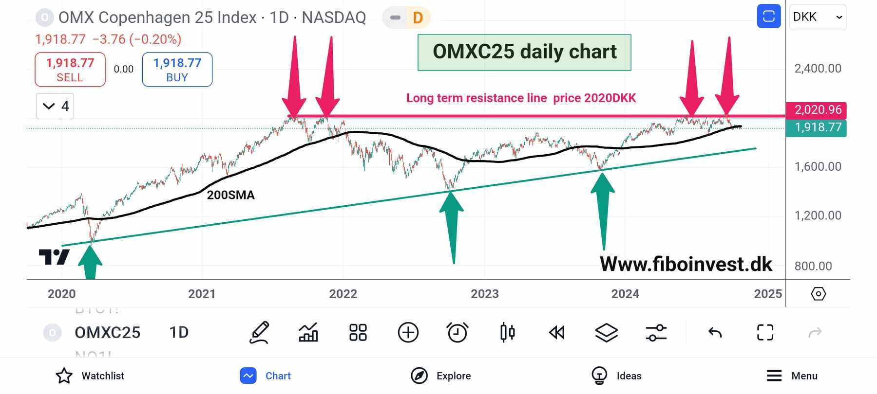 Indekset følger stadig en opadgående trendkanal, men ligger nu under både 20SMA, 50SMA og 200SMA. Sælgerne har presset kursen under 200SMA på 1.940 DKK, som var den kortsigtede støtte. Der er modstand omkring 1.940-1.965 DKK og støtte ved 1.800 DKK. Den langsigtede modstand ligger omkring 2.020 DKK, som er blevet testet flere gange, men kursen blev presset ned(