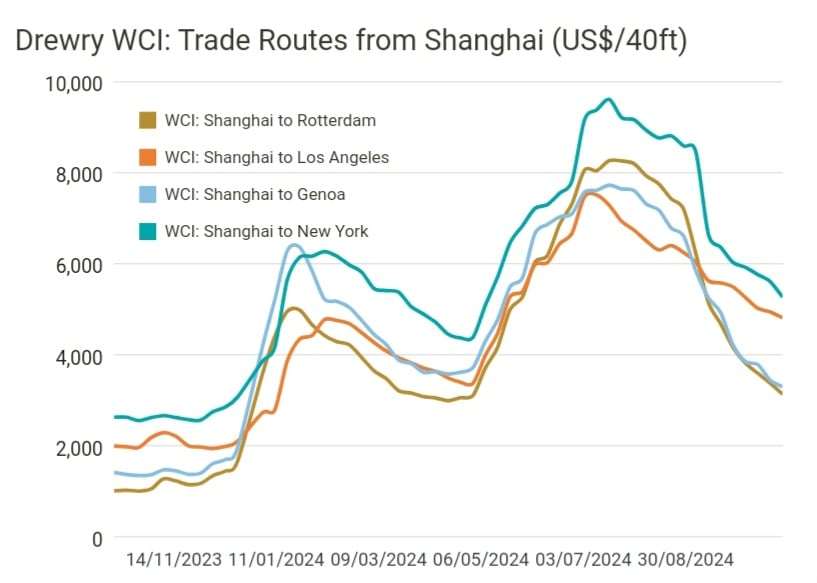 ♦Containerfragtrater faldt med 4% til $3.095 pr. 40FT, hvilket stadig er 118% over gennemsnittet fra 2019 ($1.420), men 60% under toppen i 2021 ($10.777 i september 2021).