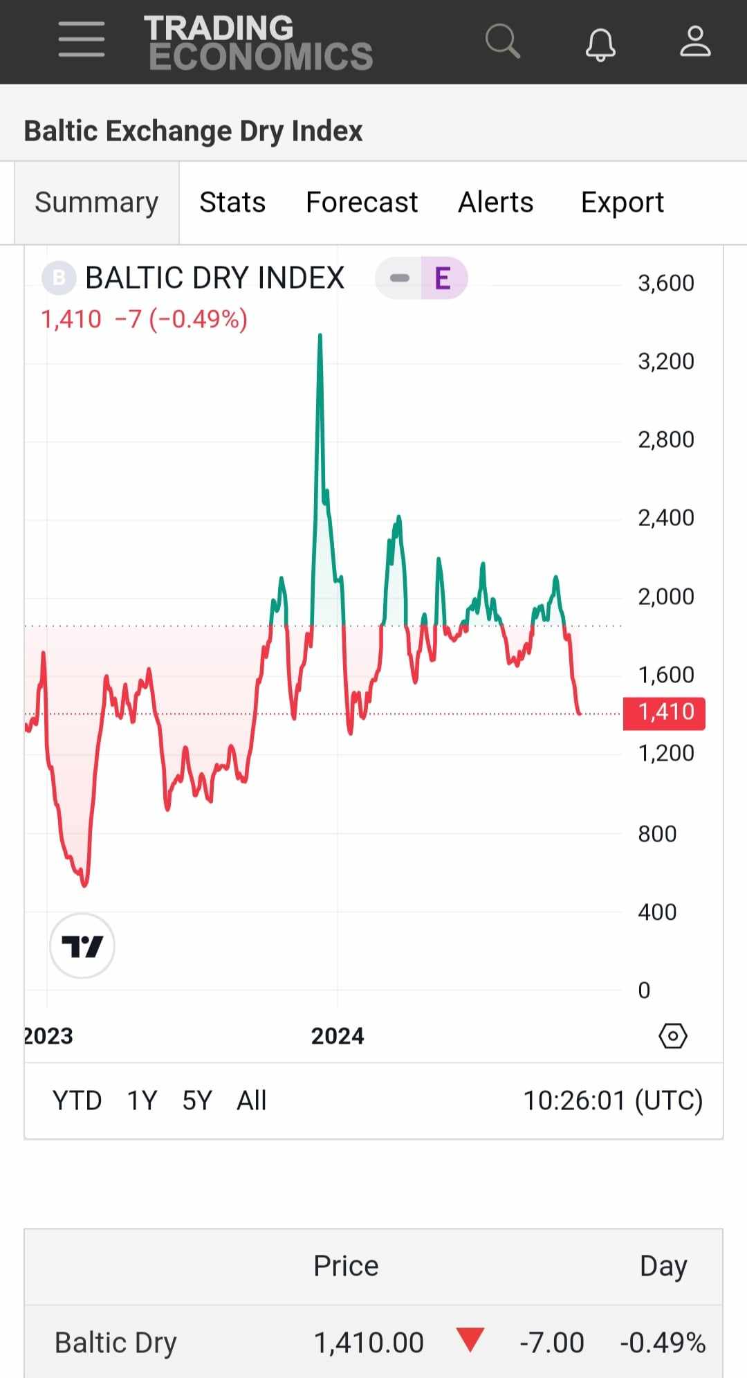♦Tørlastrater (DBI) faldt med $1.576 til $1.410, et fald på 32,5% over den seneste måned og 15,16% over det seneste år.